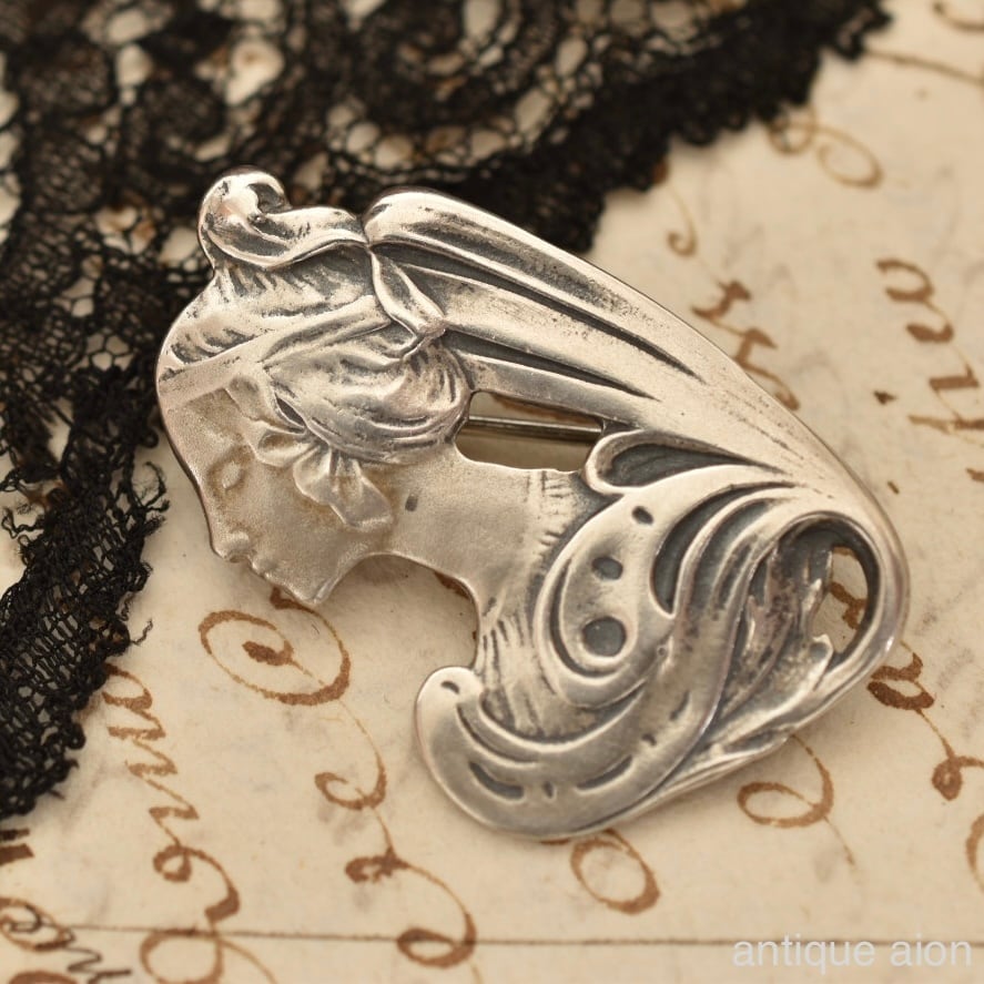アールヌーヴォー様式の美しく滑らかな自由曲線を纏う、清廉な女性の横顔が彫銀されたブローチになります。