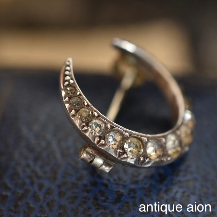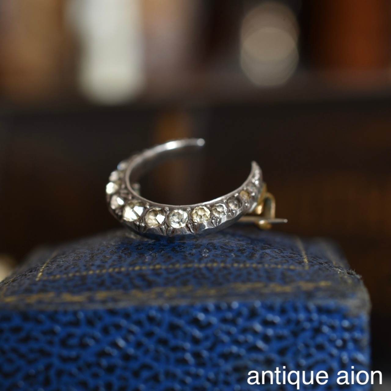 静寂の夜空に浮かぶ三日月、美しく描かれた弧上にはオールドカットのペーストガラスが装飾されていて、月明かりのような神秘的な煌めきが胸元を上品に照らします。