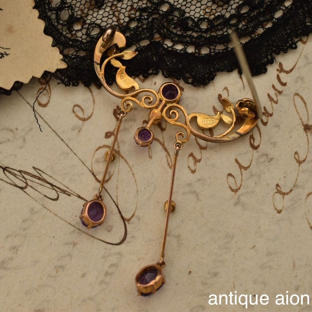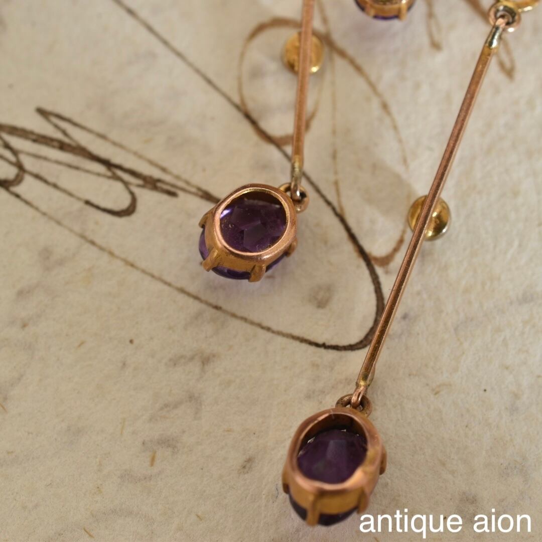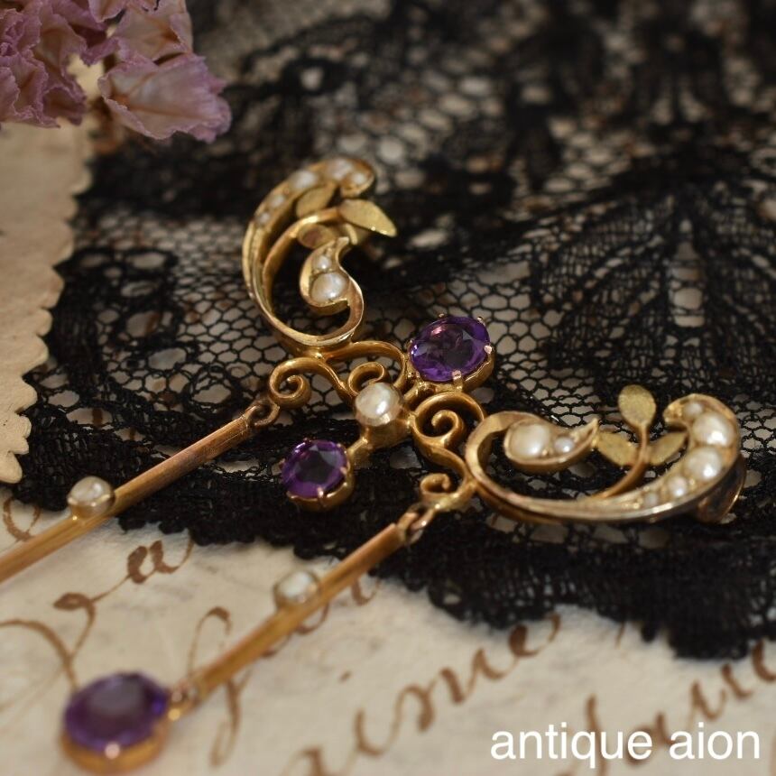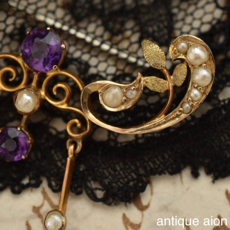 経年により落ち着いた風合いの9ctゴールドは鮮やかな紫色の天然アメジスト、濃い艶の天然パールに良く調和し、上品で風情が感じられます。