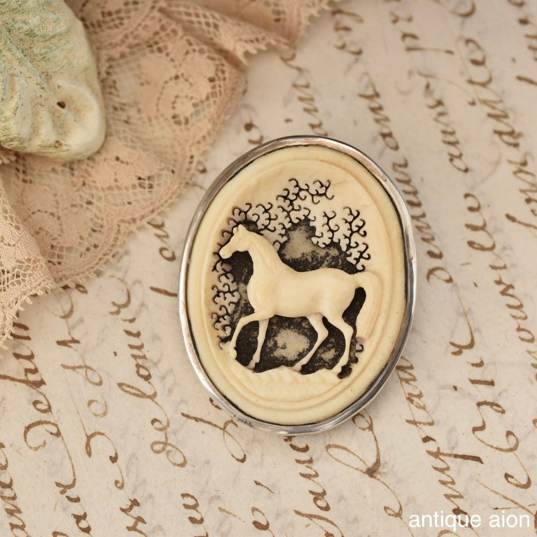 英国ヴィンテージ 1950-60年代頃 スターリングシルバー 浮き彫り細工のホースブローチ